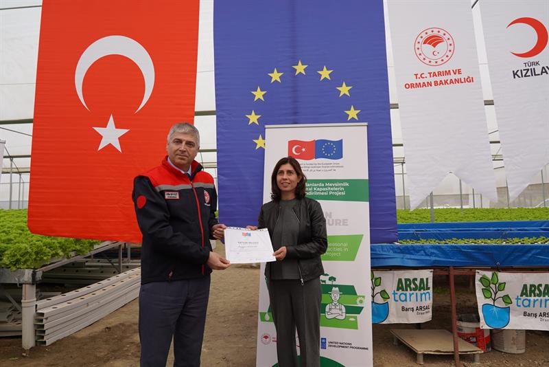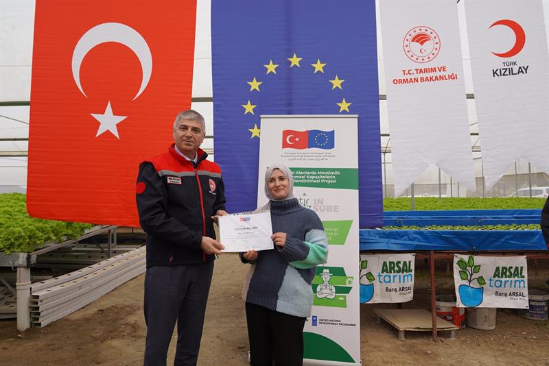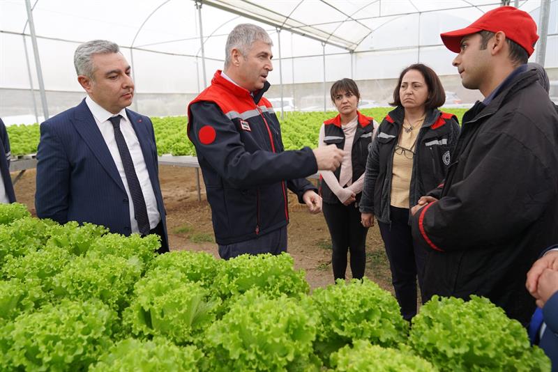 İl Tarım ve Orman Müdürü Atilla Bayazıt, Bakanlığımız Hayvancılık Genel Müdürlüğü koordinasyonunda, Birleşmiş Milletler Kalkınma Programı (UNDP) ve Türk Kızılayı iş birliğinde yürütülen INSURE – Kırsal Alanlarda Mevsimlik Tarımsal Kapasitelerin Güçlendirilmesi Projesi uygulama sahasında incelemelerde bulundu. Ziyaret kapsamında hidroponik ortamda marul yetiştiriciliği yapan genç girişimciden çalışmalar hakkında bilgi alındı ve proje paydaşı kursiyerlere sertifikaları takdim edildi.